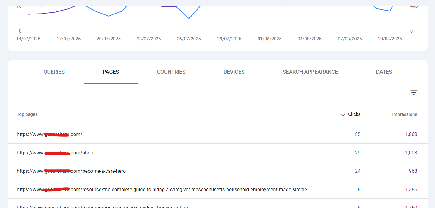 在「效果」报告中切换到 页面(Pages) 标签,这一步对程序化 SEO(Programmatic SEO)尤为重要,可以帮助你判断新生成的页面是否真的获得了流量。