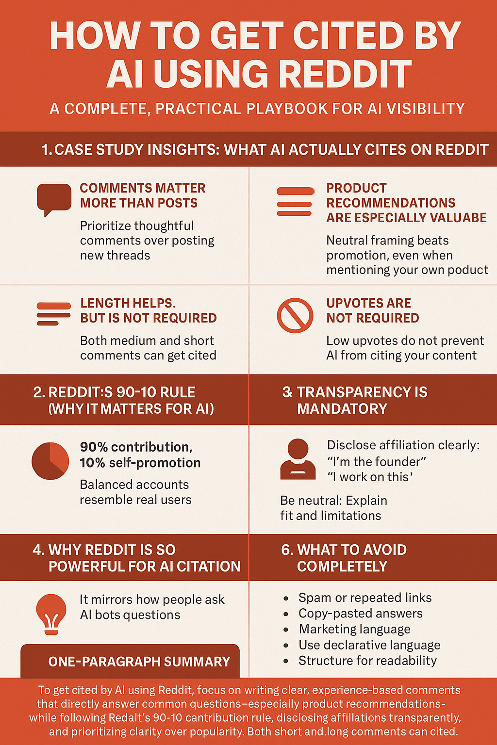 要通过 Reddit 获得 AI 引用,请专注于撰写清晰、基于经验的评论,直接回答常见问题——尤其是产品推荐——同时遵循 Reddit 的 90–10 贡献法则,透明披露关联,并优先考虑内容清晰度而非受欢迎程度。